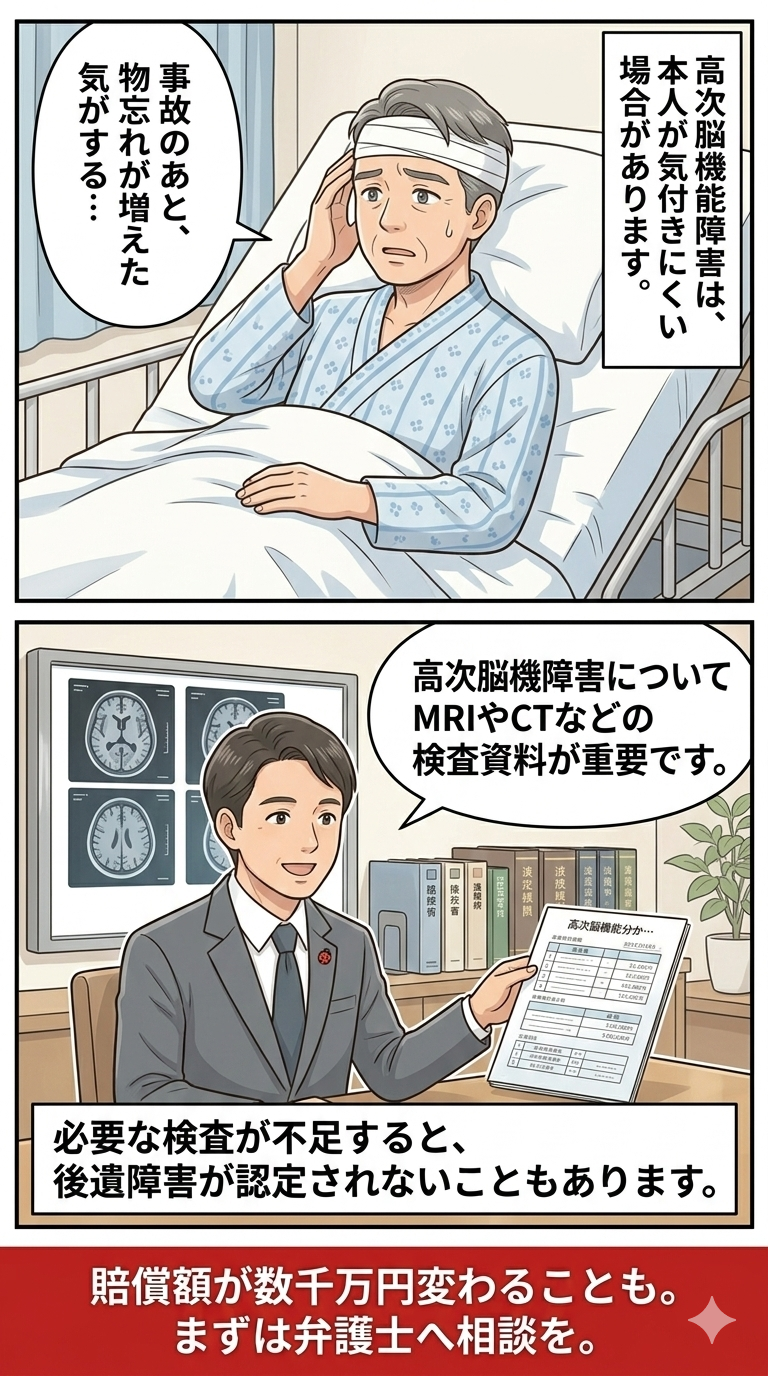 治療中から弁護士に相談して、 症状固定までに高次脳機能障害の後遺障害の認定に必要な頭部MRI,CT等の検査をして適切な後遺障害の申請をすることが必要です。