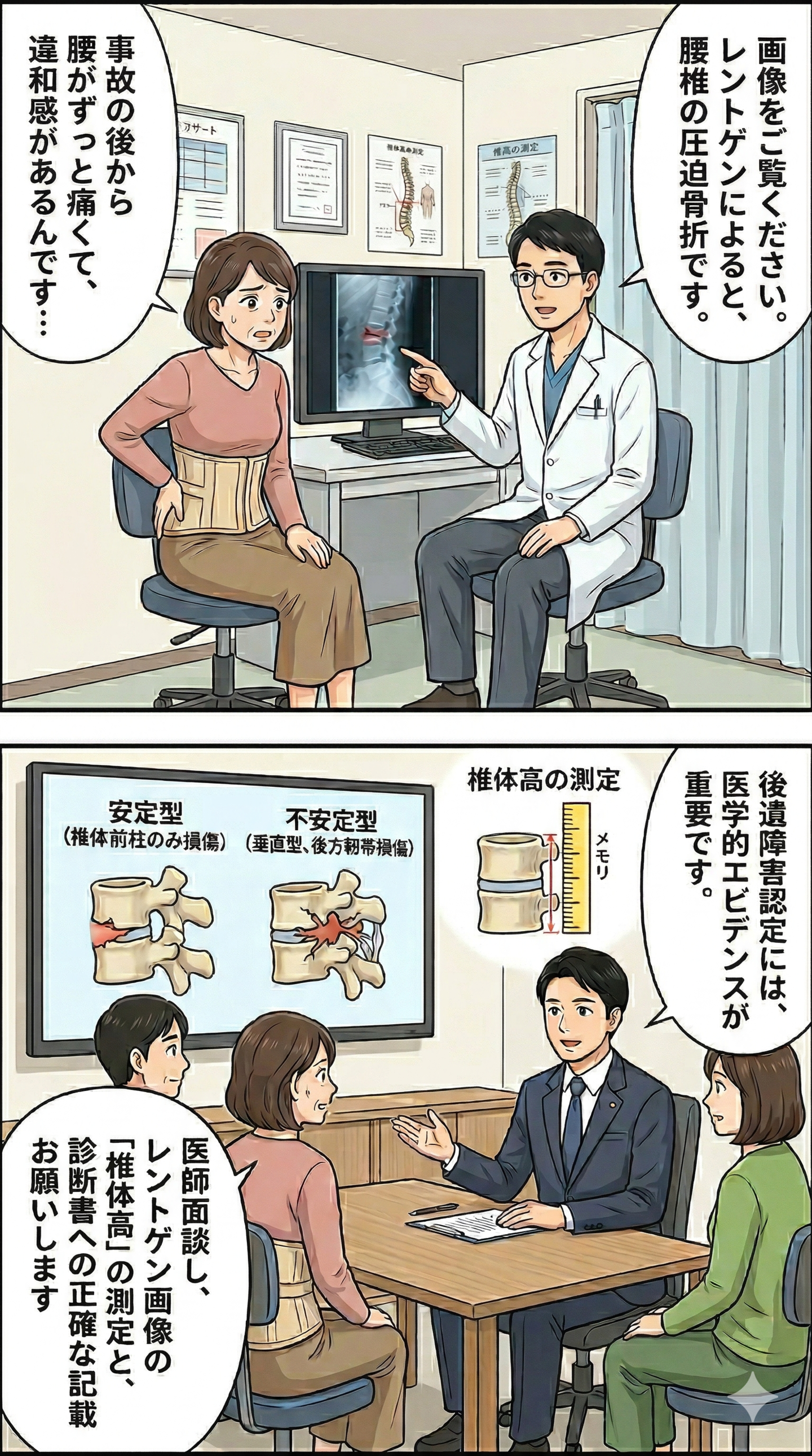 腰椎圧迫骨折によって、上半身の自重を支えきれなくなるなどの場合には後遺障害にが言おうする場合があります。