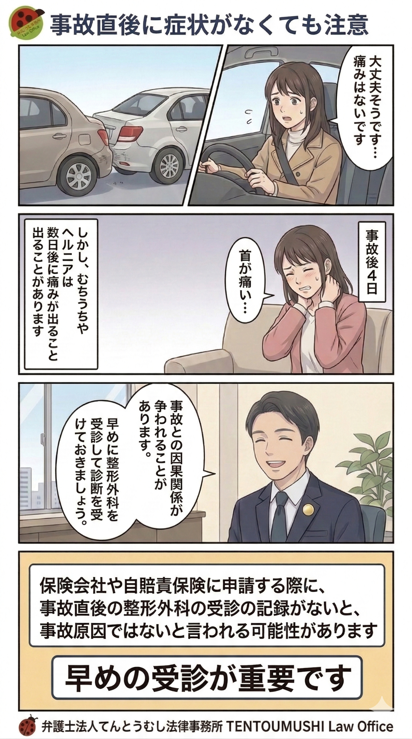 実務上、3日から一週間程度後のむち打ち(頸椎捻挫)やヘルニア(腰椎捻挫)の自覚症状の追加であれば、支払いに応じてくれることもありますので、首の痛みや腰の痛みが生じた場合には、速やかに医師にその旨を伝えて診断記録に記載しておくことが重要です。