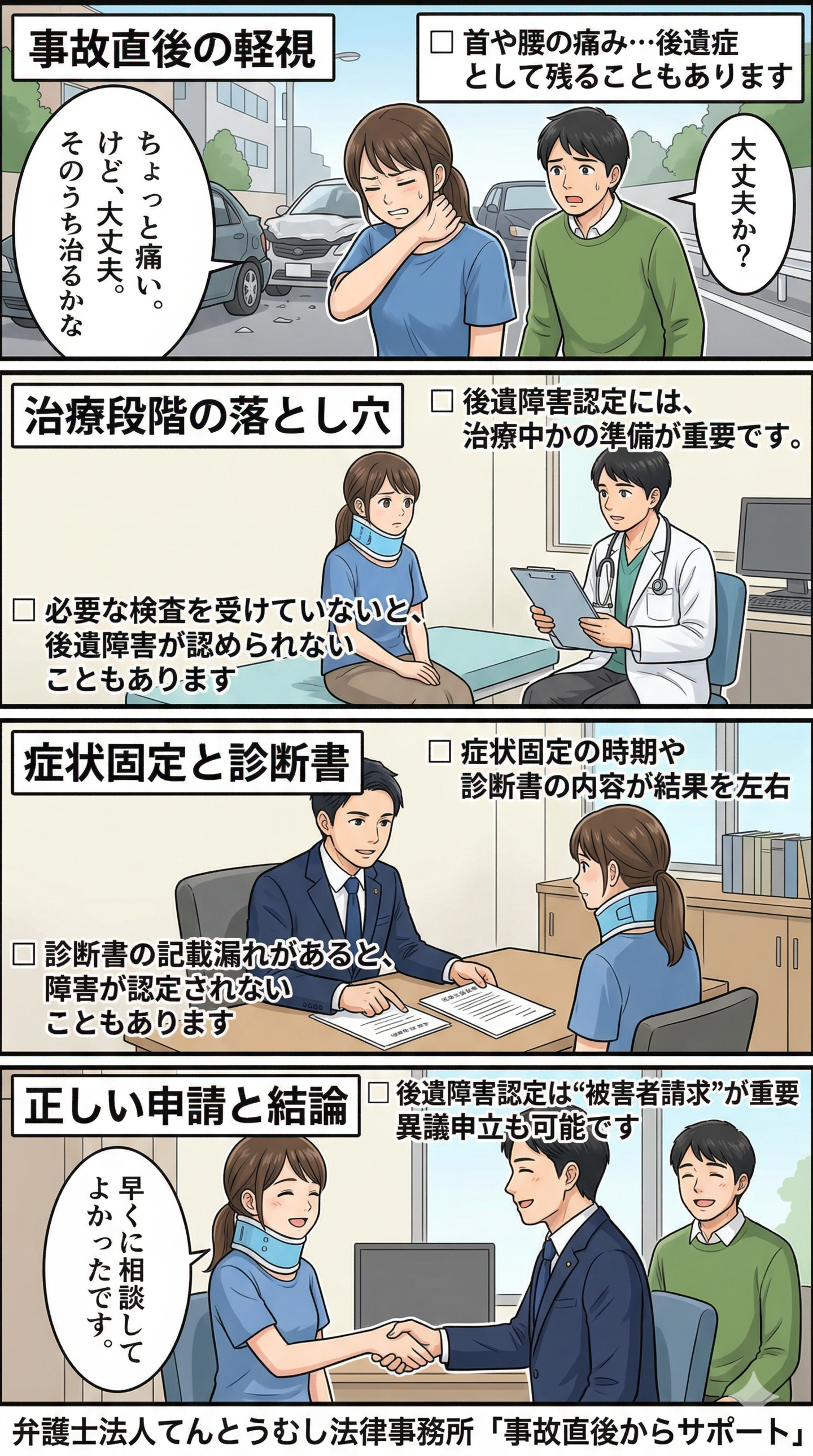 しかし,後遺症が残る可能性がある場合には,事故直後から交通事故の後遺障害申請の経験がある弁護士に相談し,障害が残りそうな部位、機能ごとに必要な治療、検査を受けておくことが重要です。