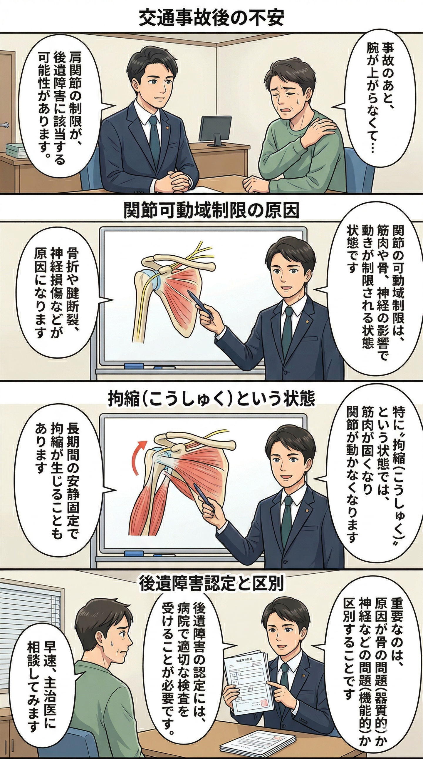 交通事故では、骨折後の固定、腱・筋損傷、神経障害などを契機に拘縮が発生し、後遺障害等級の判断に重要な要素となります。